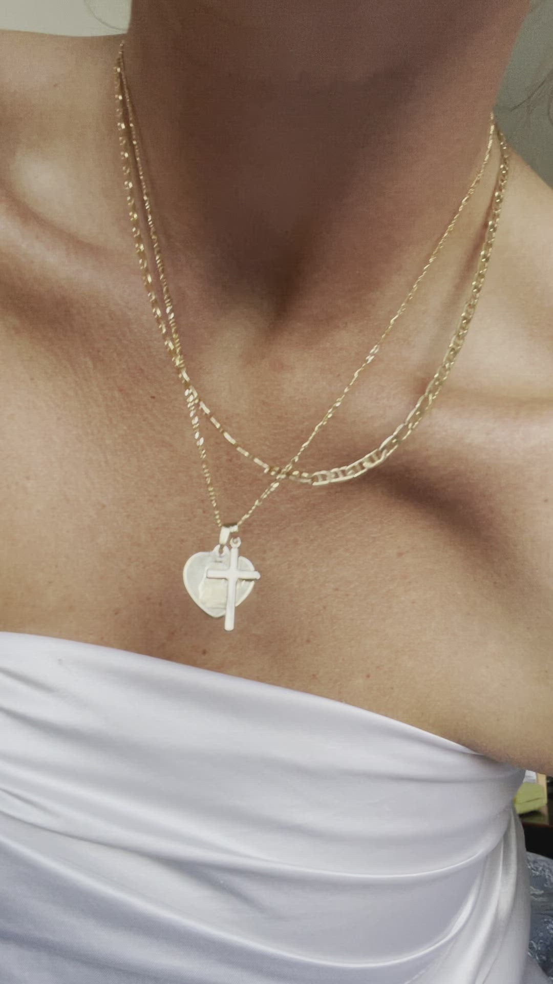 Bellas Necklace - A duet of our Solid Gold Cupid Heart & Cross charms suspended on our signature solid gold figaro chain.