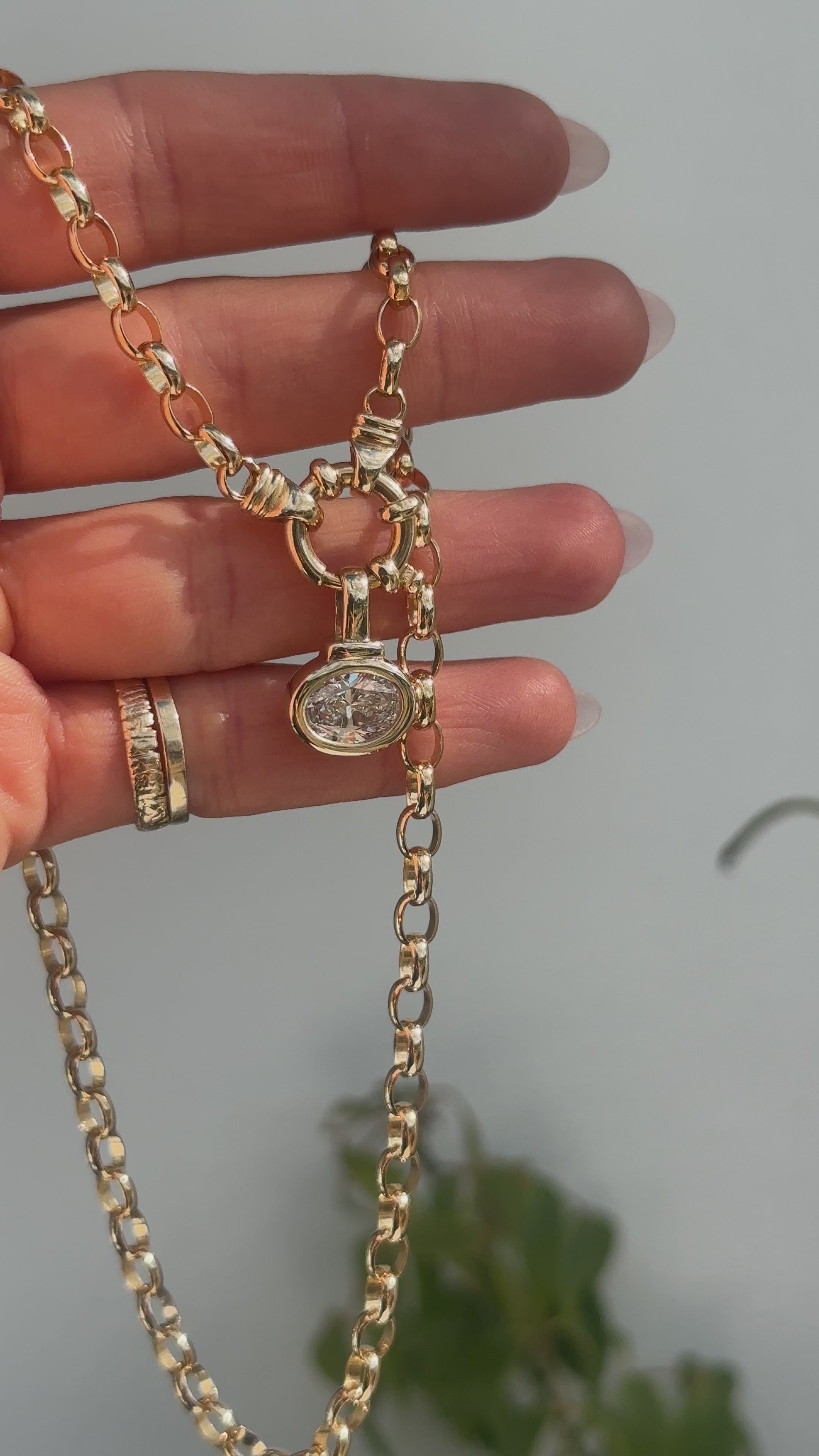 Our signature Euro bolt belcher chain meets modern luxury with a radiant 2.5ct oval lab-grown diamond pendant. The fully detachable pendant offers endless styling possibilities, wear it as a statement piece or keep it classic with just the chain.