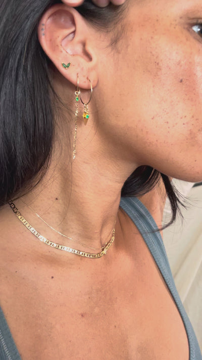 Hand made by Astrid Montague, the hoops and diamond shape are made from solid 9ct gold, finished with a beautiful vermeil emerald gemstone.