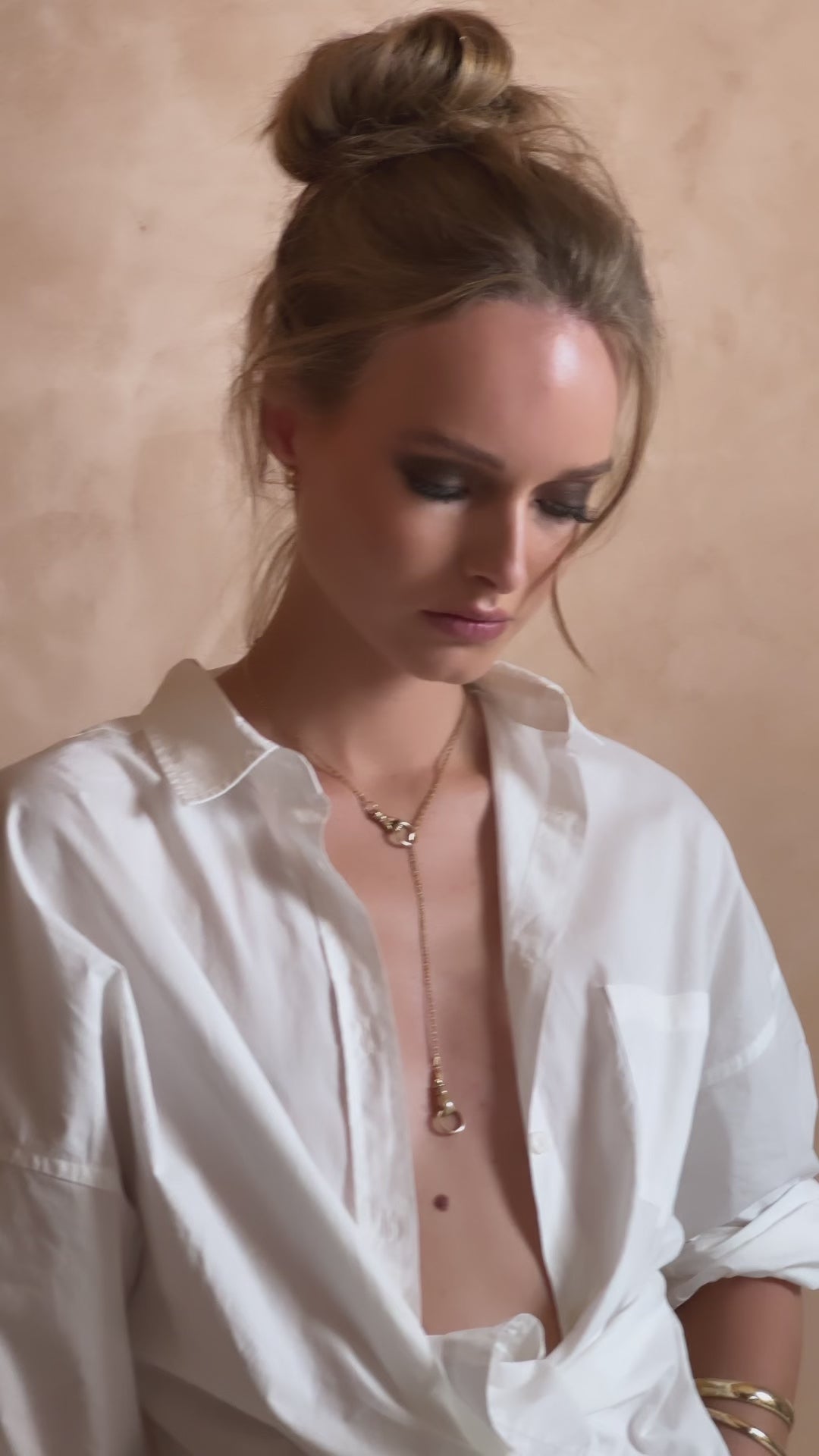 Elegantly embellish your décolletage with the allure of our 9ct Gold "Hands of Infinity" Necklace. Featuring a 45cm or 50cm long Anchor chain beautifully accented with hand and circle charms on each end, that threads through another to form a mesmerising, free-flowing, and interwoven necklace.