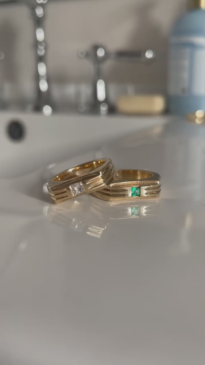 The Osiris ring is one of the more masculine rings in our Raw Treasures collection. It is an intricately detailed ring featuring a centre faced flush set 3mm square Lab Emerald. With its beaming energy and heavy weight in gold, you'll feel the presence of this ring the moment you wear it.
