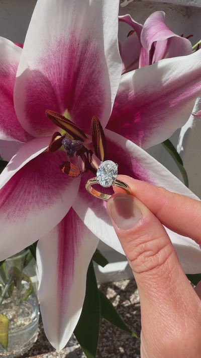 - Diamond: Lab-grown Oval cut, E-F colour, VVS1–VVS2 clarity (email us for natural diamond quotes)